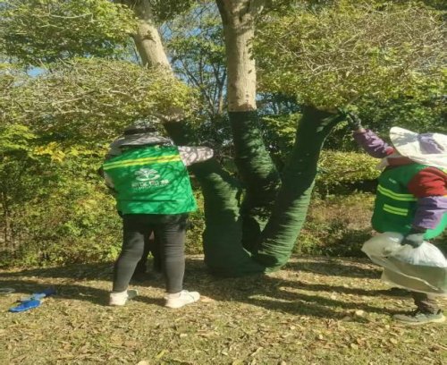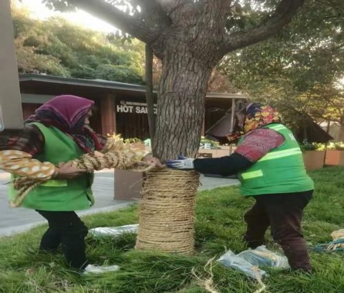 对乔木根颈、怕冻灌木进行包裹,地被覆盖地表,如同为植物盖上一层温暖的“棉衣”,让每一株植被都能安稳过冬。